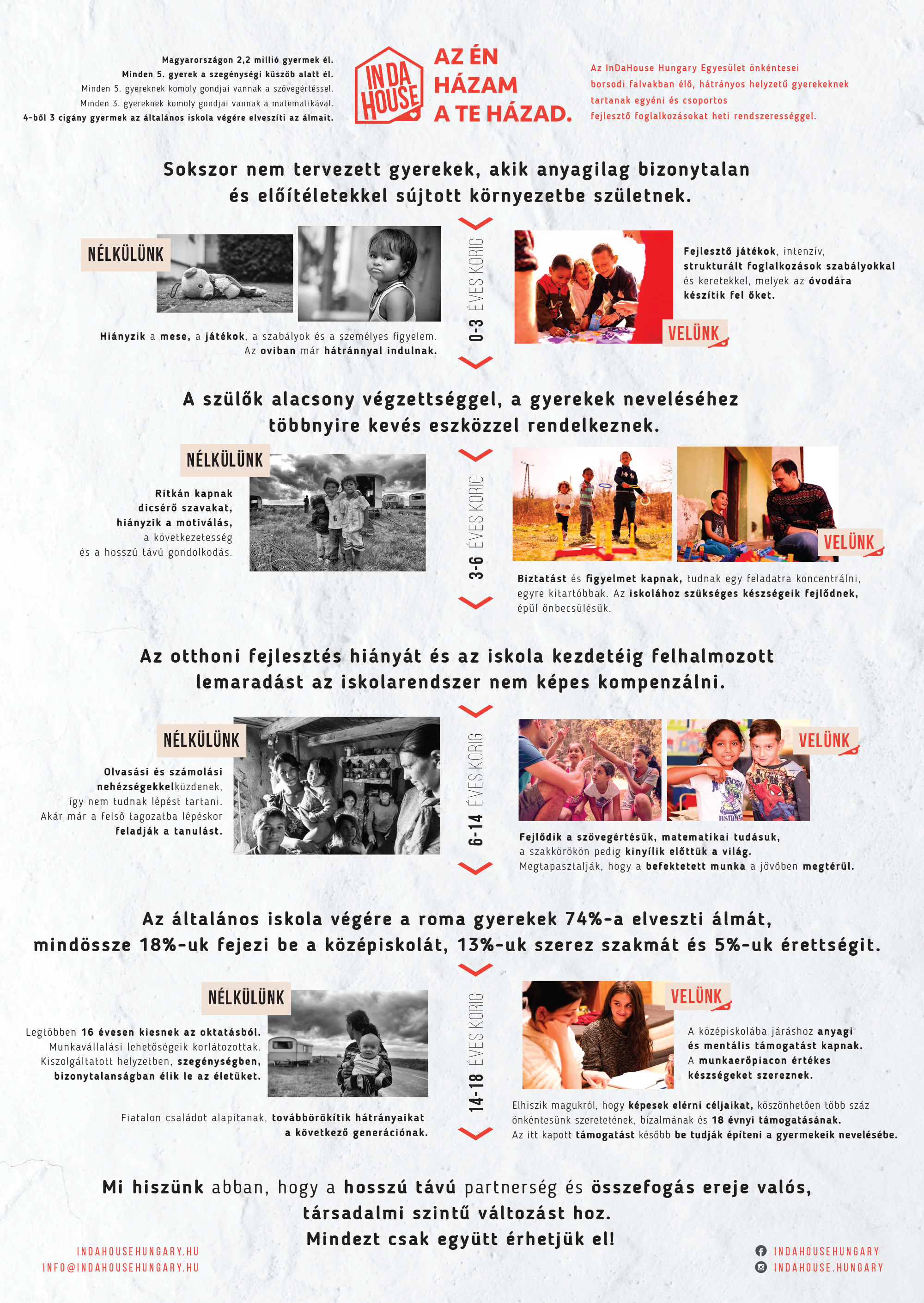 Az InDaHouse Hungary Egyesület önkéntesei borsodi falvakban élő, hátrányos helyzetű gyerekeknek tartanak egyéni és csoportos fejlesztő foglalkozásokat heti rendszerességgel. Céljuk, hogy a hozzájuk járó gyerekek önmegvalósító, felelős, a saját sorsukat irányító felnőttekké váljanak, akik a tőlük kapott támogatást be tudják építeni a gyermekeik nevelésébe. 2019-ben megnyították az InDaHouse Önkéntes- és Gyerekközpontot Hernádszentandráson, ami gyermekfoglalkozásoknak és önkéntesszállásnak ad helyet.